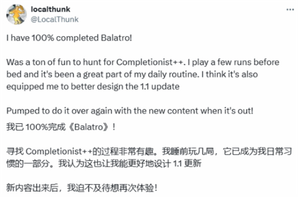 此前,LocalThunk曾在平台上无奈表示,自己距离该成就仍差4张小丑卡,笑称“这是我自食其果”。而如今,他终于挺过难关,并表示这段经历不仅为自己带来了成就感,也让他在为游戏后续1.1版本开发时拥有了更多设计灵感。