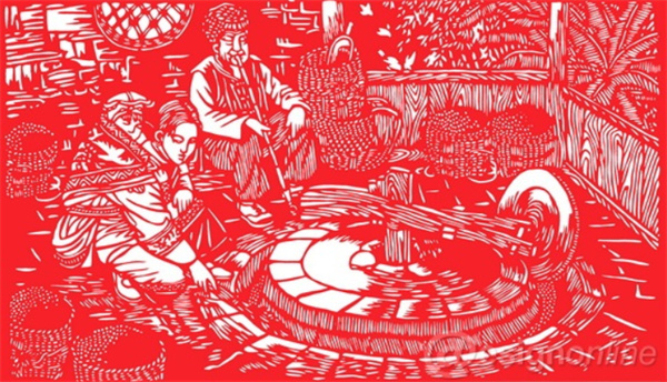 踏虎凿花是一种流传于福建长汀等地的传统民间工艺,被称为“不用剪刀的剪纸艺术”。它与普通剪纸不同,不使用剪刀或刻刀,而是采用一种特制的铁凿,配合木槌,在多层叠放的红纸或彩纸上敲打凿制图案。