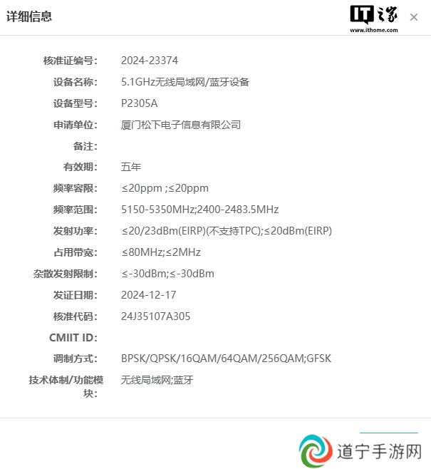本站 12 月 21 日消息,刚发布 G97、ZS99 两款相机,松下本周又注册了一款新品,型号为“P2305A”,支持 5.1GHz 双频无线网络,但关于该机的具体型号和参数规格目前我们尚不得而知。