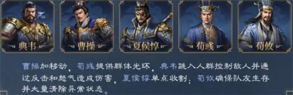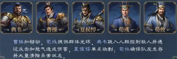 核心阵容:曹操、夏侯惇、张辽、许褚、典韦、荀彧、郭嘉