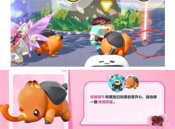 核心机制:让暖暖犀牛靠近其他暖暖犀牛并跳舞,持续几分钟后自动掉落信物。