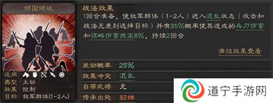 倾国倾城:1回合准备,使敌军群体1-2人进入混乱状态(攻击和战法无差别选择目标)并有35%概率使其造成的兵刃伤害和谋略伤害提高,持续2回合。