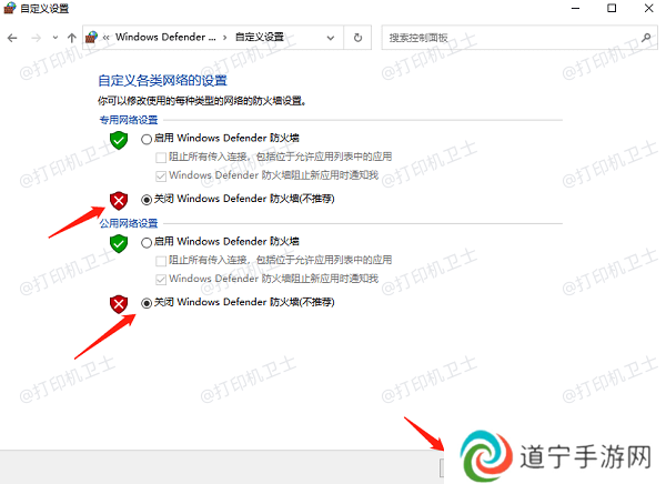 点击启用或关闭 Windows Defender 防火墙,将网络类型下的防火墙设置为“关闭”。检查是否可以搜索到打印机。