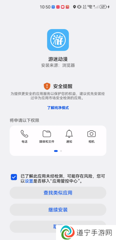 3、接下来点击勾选“已了解此应用未经检测……”,点击“继续安装”。(还可以点击了解纯净模式)