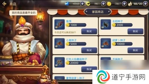 家园商店:通过家园商店购买种子、鱼饵等物品,进行种植和钓鱼等家园活动,可以获得一定的金币收益。