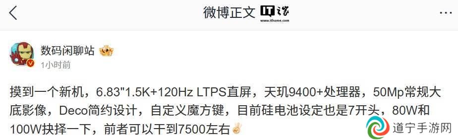 近日,知名数码博主@数码闲聊站在其社交媒体平台上发布了一系列关于某品牌即将发布的新机信息,引起了广泛关注。据透露,这款新机将搭载联发科的天玑9400+处理器,配备了一块6.8英寸的1.5K分辨率加120Hz刷新率的LTPS直屏,设计上则采用了简约风格的Deco设计,并搭载了50Mp的常规大底影像系统。